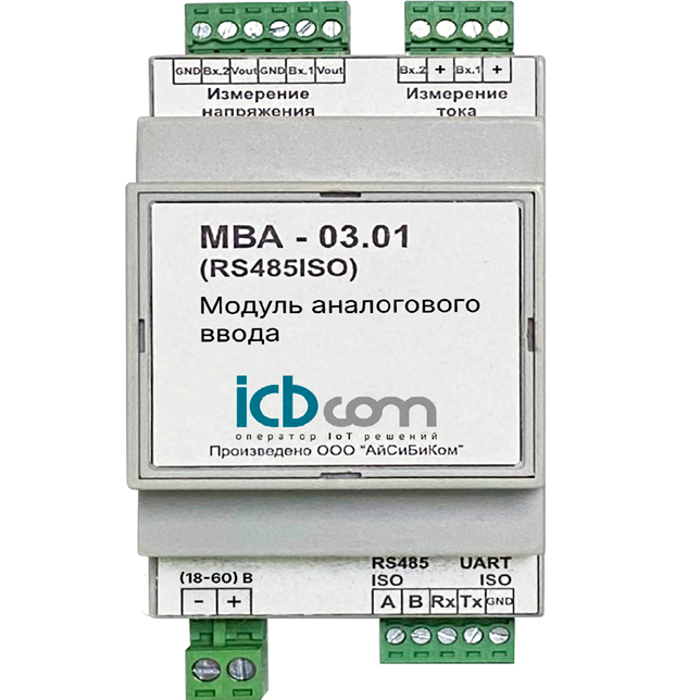 Модуль аналогового ввода МВА-03.01 предназначен для измерения аналоговых сигналов, поступающих от датчиков различного типа со стандартизованными выходными сигналами, преобразования этих сигналов в цифровые значения, и последующей передачи этих значений по сети RS-485. Модуль применяется для построения автоматизированных систем сбора данных. Модуль работает в сети RS485 и поддерживает протоколы Modbus RTU и ASCII с автоматическим распознаванием.